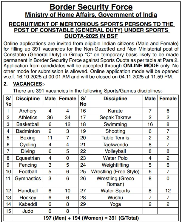 The Border Security Force (BSF), under the Ministry of Home Affairs, Government of India, has officially released the BSF Sports Quota Recruitment 2025-26 notification to fill 391 Constable (General Duty) posts. This recruitment is open to meritorious sportspersons who have represented India at international events or won medals in national competitions between 4th November 2023 and 4th November 2025. Eligible male and female candidates who have passed Matriculation (Class 10) and meet the sports criteria can apply online from 16th October to 4th November 2025 through the official BSF recruitment portal. This is an excellent opportunity for athletes across multiple sports disciplines to serve in the paramilitary forces.