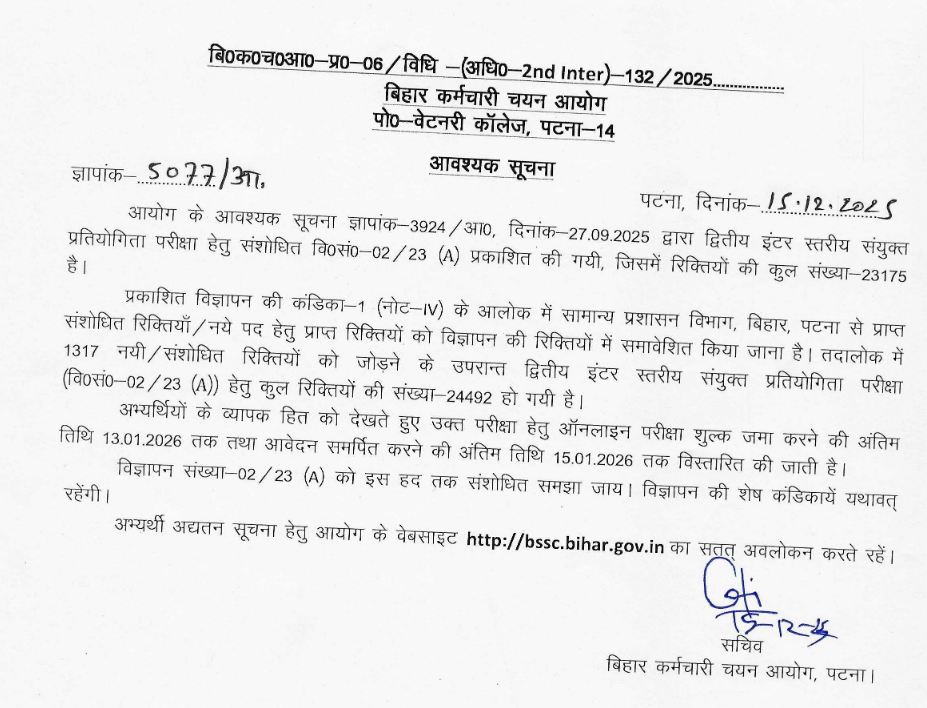 The Bihar Staff Selection Commission (BSSC) has released the official notification (Advt. No. 02/23 (A)) for Inter Level Recruitment 2025, inviting applications for a massive 23,175 vacancies across multiple departments under the General Administration Department, Patna. This recruitment aims to fill critical clerical, secretarial, and support roles, providing a stable career opportunity for 10+2 qualified candidates. The posts include Panchayat Secretary, Revenue Staff, Lower Division Clerk (LDC), Filaria Inspector, Assistant Instructor (Typing), and Typist cum Clerk, among others. The online application process begins on 15th October 2025 and will remain open until 25th November 2025, with final submission allowed until 27th November 2025 13th January 2026.