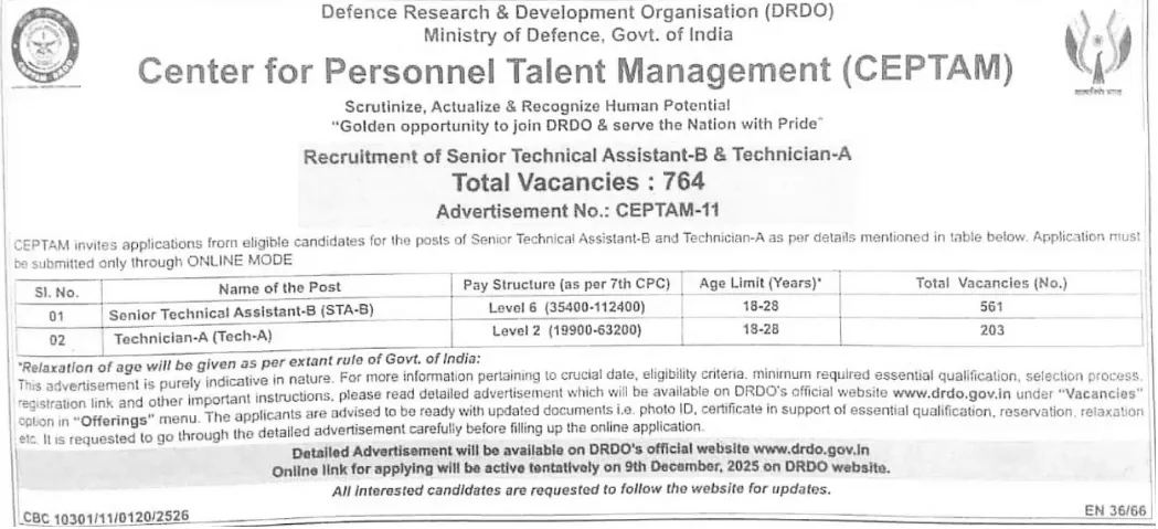 The Defence Research and Development Organisation (DRDO), through its Centre for Personnel Talent Management (CEPTAM), has announced Advertisement No. CEPTAM-11 for the recruitment of 764 vacancies under Group-B and Group-C categories. This includes the posts of Senior Technical Assistant-B (STA-B) and Technician-A (Tech-A) across various disciplines in DRDO labs and establishments throughout India. Eligible candidates with qualifications ranging from 10th pass + ITI to Diploma and B.Sc. are invited to apply online. The application process begins on 9th December 2025, with the closing date and Tier-I CBT exam date to be announced soon.