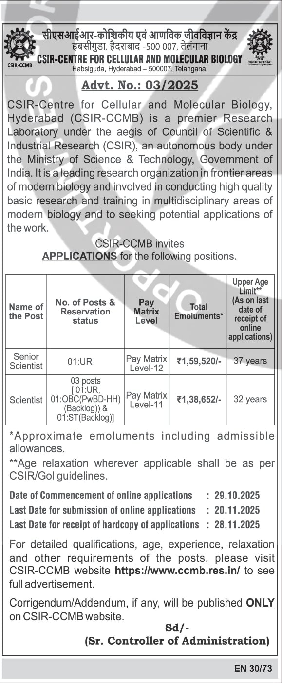 The CSIR-Centre for Cellular and Molecular Biology (CSIR-CCMB), Hyderabad, one of India’s premier research institutions under the Council of Scientific & Industrial Research (CSIR), is inviting applications for the recruitment of Scientist and Senior Scientist posts. With a strong focus on cutting-edge biological research, CSIR-CCMB offers a unique opportunity for PhD holders in life sciences, biotechnology, and related disciplines to join its vibrant scientific community. A total of 4 vacancies are available for qualified researchers to contribute to advanced research in cellular and molecular biology. The online application process begins on 29th October 2025 and will close on 20th November 2025. The last date for receipt of hardcopy submissions is 28th November 2025.