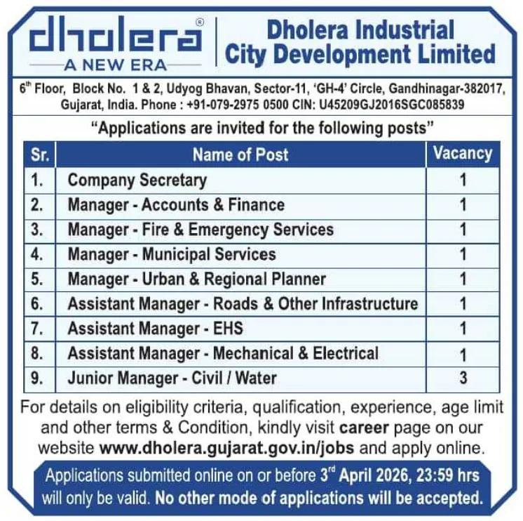 Dholera Industrial City Development Limited (DICDL), a Government of Gujarat SPV developing India’s first greenfield smart industrial city, has released the Recruitment 2026 notification for 11 posts including Company Secretary, Manager, Assistant Manager, and Junior Manager. This recruitment offers opportunities for candidates with professional and technical qualifications in finance, engineering, planning, and management fields. The selection will be based on shortlisting and interview. Interested candidates can apply online before the last date of 03 April 2026.