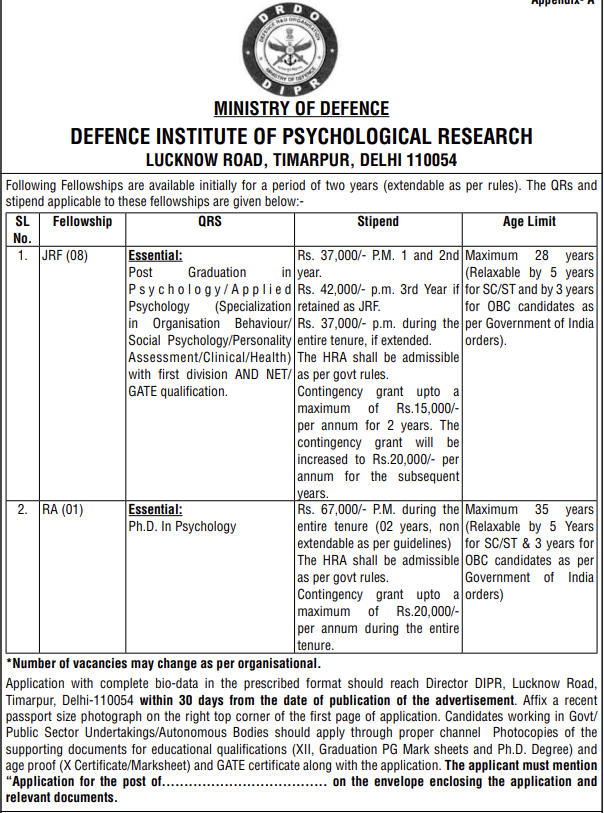 Send the completed application by Speed Post/Registered Post to: Director, Defence Institute of Psychological Research (DIPR), Lucknow Road, Timarpur, Delhi – 110054
