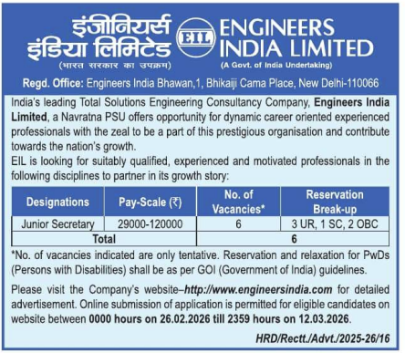 Engineers India Limited (EIL), a Navratna Public Sector Undertaking under the Ministry of Petroleum & Natural Gas, Government of India, has released the official notification for recruitment to the post of Junior Secretary on regular basis. Through Advertisement No. HRD/Rectt./Advt./2025-26/16, EIL aims to fill 06 vacancies at its New Delhi office. This recruitment provides an excellent opportunity for candidates possessing required secretarial and stenography skills to join a reputed PSU. Interested candidates must carefully review the eligibility criteria regarding age, qualification, experience, and category before applying online. The online registration process begins on 26 February 2026 and will remain open until 12 March 2026.