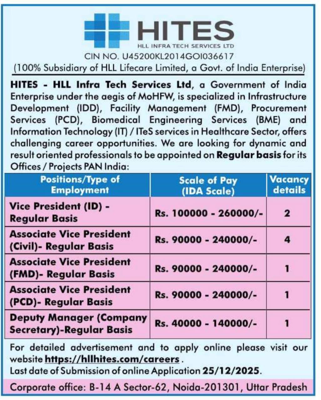 HLL Infra Tech Services Ltd (HITES), a fully owned subsidiary of HLL Lifecare Limited under the Government of India, has invited online applications from experienced professionals for 09 regular positions in diverse domains such as Infrastructure Development, Civil Engineering, Facility Management, Procurement, and Company Secretary. These appointments are aimed at strengthening operations in the Healthcare Infrastructure Sector across India. Candidates with professional qualifications and relevant experience are encouraged to apply online through the official HITES careers portal by 25th December 2025.