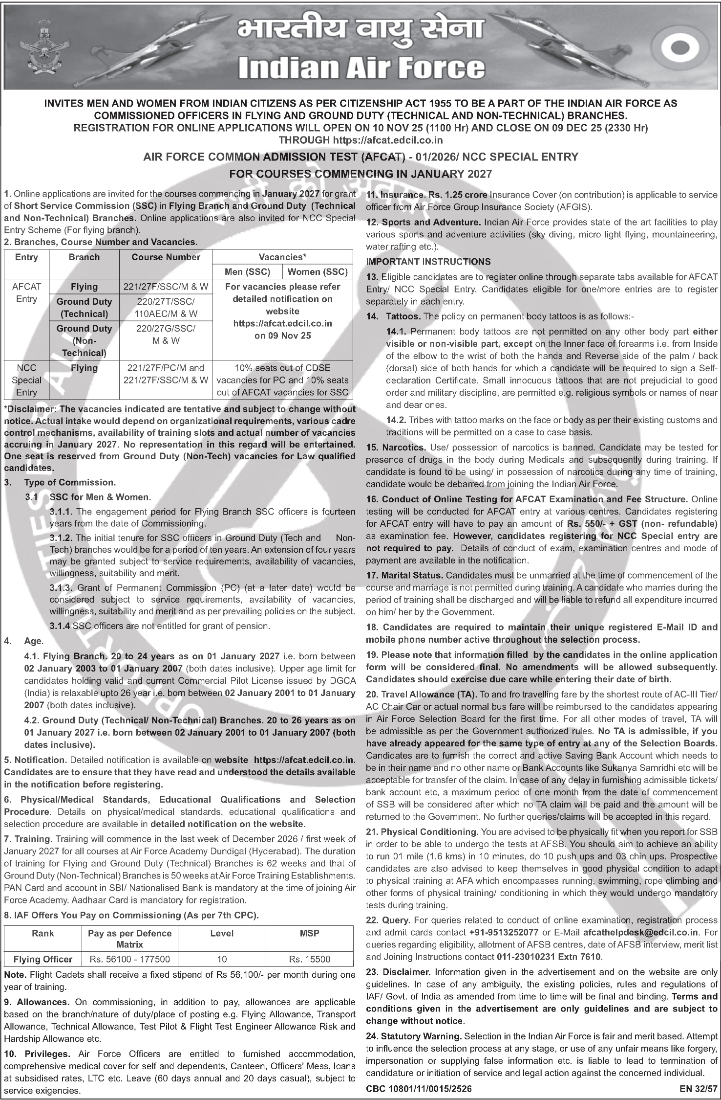 The Indian Air Force (IAF), under the Ministry of Defence, Government of India, has released the notification for AFCAT 01/2026/NCC Special Entry to recruit Men and Women for Short Service Commission (SSC) in Flying Branch and Ground Duty (Technical and Non-Technical) Branches. The recruitment is for courses commencing in January 2027, offering a gateway for graduates to become commissioned officers in the Indian Air Force. Eligible Indian citizens can apply online from 10th November 2025 to 9th December 2025 through the official AFCAT portal. This includes NCC Special Entry and Meteorology Branch vacancies as well.