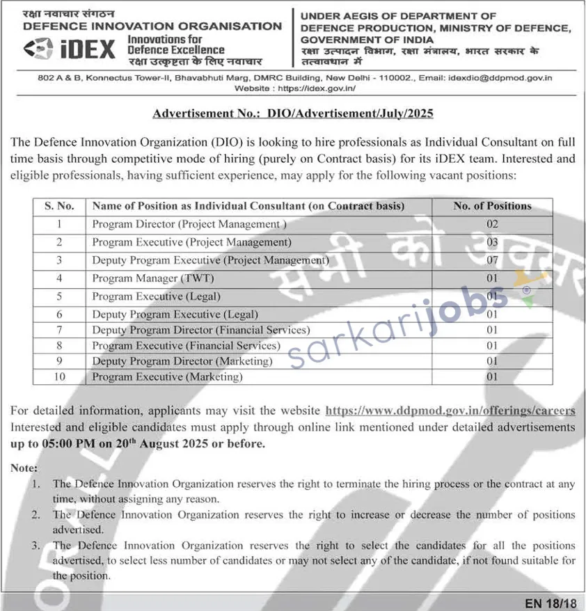 The Defence Innovation Organization (DIO), operating under the Department of Defence Production, Ministry of Defence, has invited applications from qualified professionals for various consultant positions in its iDEX team. The recruitment is purely on a contractual basis and offers opportunities across project management, legal, financial services, and marketing domains.