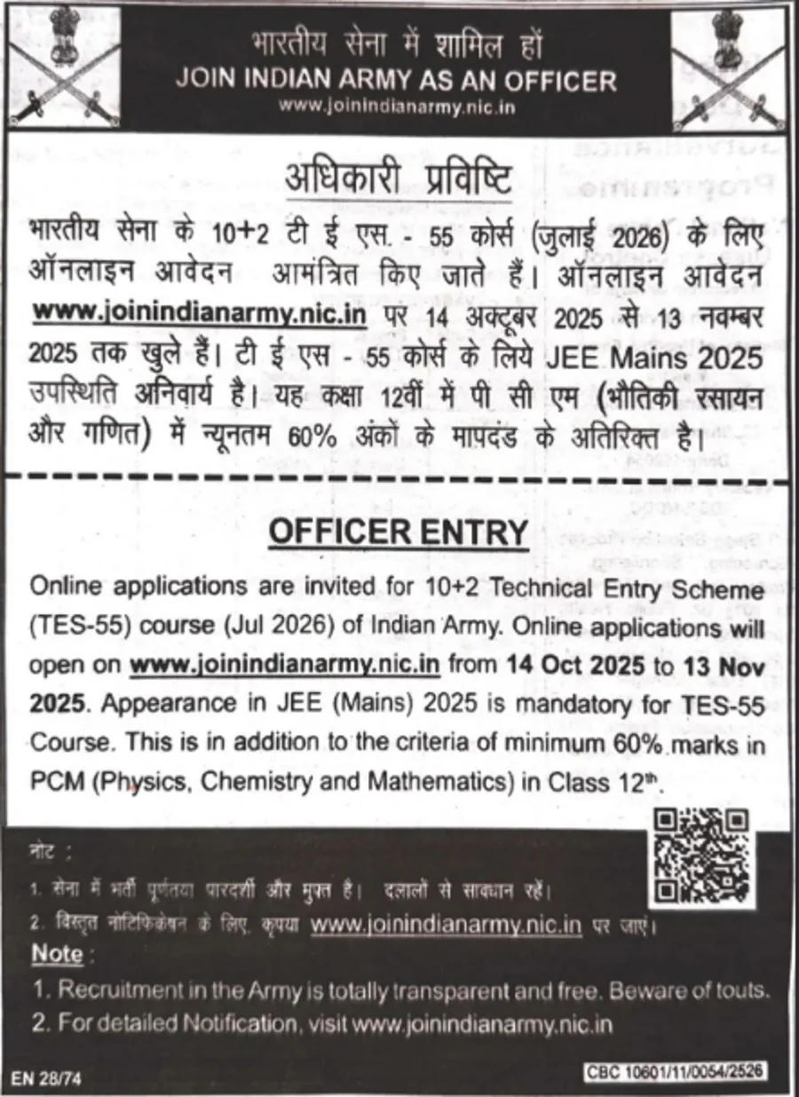 The Indian Army has released the official notification for the 10+2 Technical Entry Scheme (TES-55), a prestigious opportunity for unmarried male candidates who have completed their 10+2 with Physics, Chemistry, and Mathematics (PCM) and appeared for JEE (Mains) 2025. The selected candidates will undergo a 4-year training program leading to a Permanent Commission in the Indian Army as an Officer. A total of 90 provisional vacancies have been announced for this course commencing in July 2026.