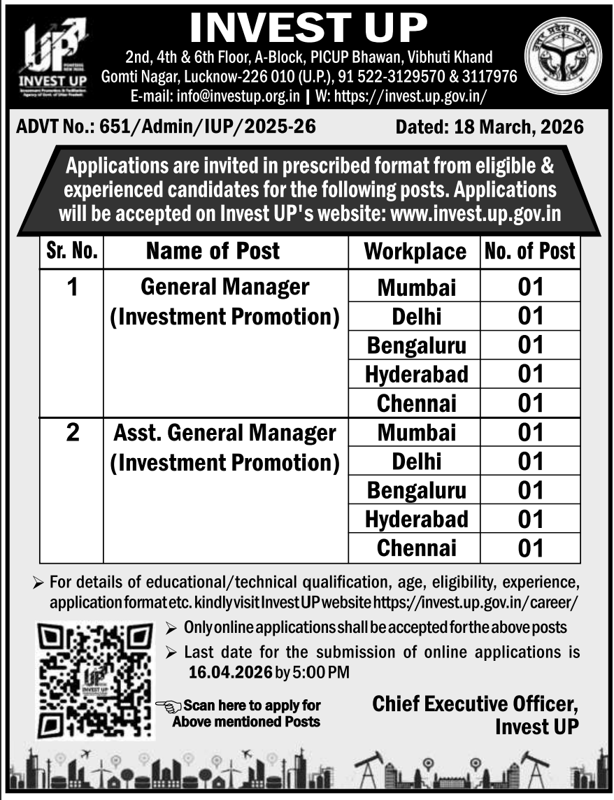 Invest UP, the Investment Promotion Agency of the Government of Uttar Pradesh, has released a recruitment notification for 10 posts of General Manager and Assistant General Manager (Investment Promotion). This recruitment offers an excellent opportunity for experienced professionals with relevant degrees and industry experience to work in major metro cities across India. The vacancies are equally divided between General Manager and Assistant General Manager roles. Candidates must ensure eligibility in terms of qualification and experience before applying. The application process is online and the last date to apply is 16 April 2026 (5:00 PM). Interested candidates should apply within the given timeline.