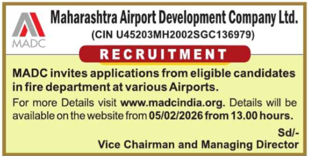 Maharashtra Airport Development Company Ltd. (MADC), the nodal agency responsible for airport infrastructure and development in Maharashtra, has announced upcoming recruitment for various Fire Department positions across its managed airports. These include vital locations such as Shirdi Airport and Nagpur’s MIHAN project. The Fire & Emergency Services Department plays a crucial role in ensuring compliance with Maharashtra Fire Prevention & Life Safety Measures Act 2006, NBC-2016, and UDCPR guidelines. The detailed notification including post names, total vacancies, eligibility criteria, pay scale, application process, and selection procedure will be available from 05 February 2026 at 13:00 hrs on the official website www.madcindia.org.