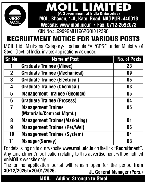 MOIL Limited, a Schedule-A Miniratna Category-I Public Sector Enterprise under the Ministry of Steel and India’s largest producer of manganese ore, has announced recruitment for 67 vacancies across various technical and management disciplines. Through Advertisement No. GT/MT-MGR/12/2025, MOIL invites applications for the posts of Graduate Trainee, Management Trainee, and Manager (Survey). These positions are open to qualified candidates with B.E./B.Tech, MBA, or Postgraduate Degrees in relevant fields. The positions are based at MOIL units in Maharashtra and Madhya Pradesh. Interested candidates can apply online from 30th December 2025 to 20th January 2026.