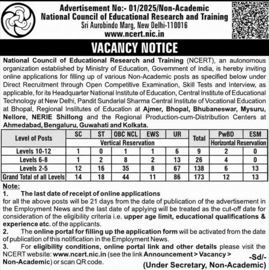 The National Council of Educational Research and Training (NCERT) has released Advertisement No. 01/2025/Non-Academic inviting online applications for 173 Non-Academic vacancies across Group A, B, and C posts. These positions are available at NCERT Headquarters in New Delhi and its constituent units across India. The recruitment process involves an open competitive examination, skill test, and/or interview depending on the post. Candidates must apply online within 21 days from the date of publication of the notification in Employment News (expected on or around 20th December 2025).
