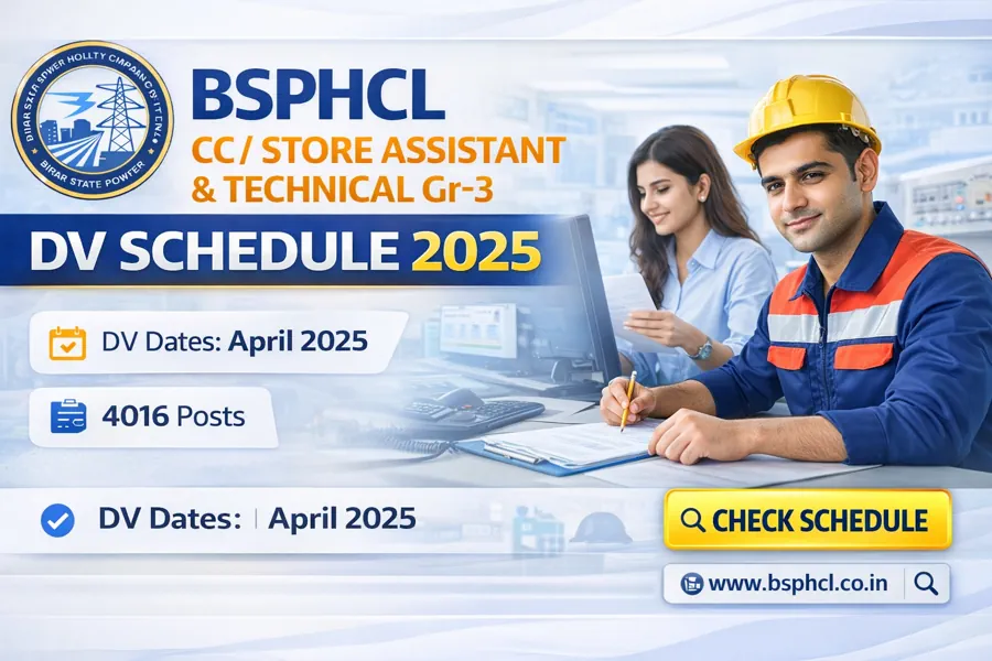 Bihar State Power Holding Company Limited (BSPHCL) has officially released the Document Verification (DV) Schedule for the posts of Technician Grade III, Junior Accounts Clerk, Correspondence Clerk, Store Assistant, Junior Electrical Engineer (JEE GTO), and Assistant Executive Engineer (AEE GTO). The recruitment drive was conducted for a total of 4016 vacancies across Bihar. Candidates who appeared in the examinations conducted between June and July 2025 can now access the DV schedule released on 13 March 2026. Applicants who qualified in the written examination and are listed for document verification must download the DV schedule and check their reporting dates and instructions.