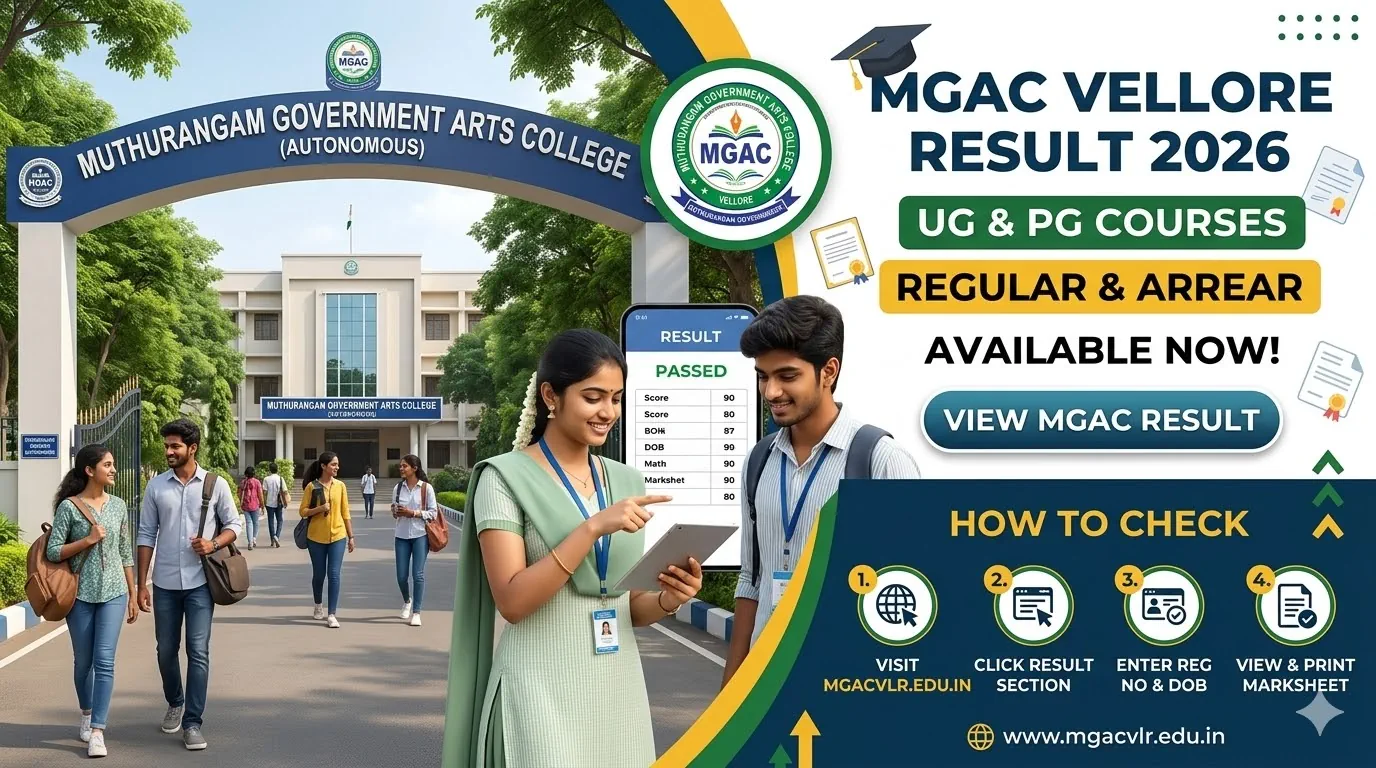 Muthurangam Government Arts College (MGAC), Vellore conducts semester examinations for various undergraduate and postgraduate courses in Arts, Commerce, and Science streams. Students who appeared for the recent semester exams are now waiting for the MGAC Result 2026 announcement and can check the result date, official link, and steps to download the marksheet below.