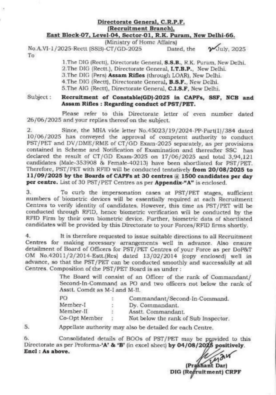 Staff Selection Commission (SSC) has announced the Physical Test schedule for Constables (GD) in CAPFs, NIA, SSF, and Rifleman (GD) in Assam Rifles under the 2023 recruitment drive. The written examination was held from 20 to 29 February 2024 and 01 to 12 March 2024, followed by a re-exam on 30 March 2024. The final answer key was released on 10 July 2024. A total of 46,617 vacancies were notified for this recruitment, making it one of the biggest drives by SSC. The Physical Efficiency Test (PET) and Physical Standard Test (PST) will now be conducted from 20 August to 11 September 2025 for candidates who qualified in the written examination.