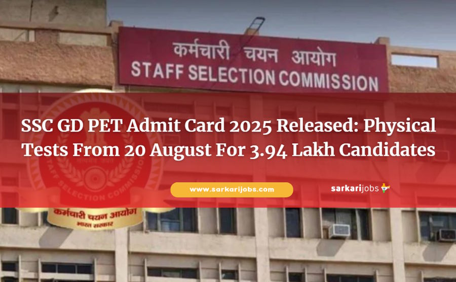 The Staff Selection Commission (SSC) has released the Physical Efficiency Test (PET) admit card for the SSC GD Constable recruitment. PET/PST will be conducted by the Central Reserve Police Force (CRPF) for 3,94,121 candidates shortlisted through the CBT—3,53,908 male and 40,213 female candidates. The physical tests will run from 20 August to 11 September 2025 across about 300 centres, with roughly 1,500 candidates scheduled daily. All CBT-qualified candidates must download their PET admit card from rect.crpf.gov.in and report as per the date, time and venue printed on the admit card.