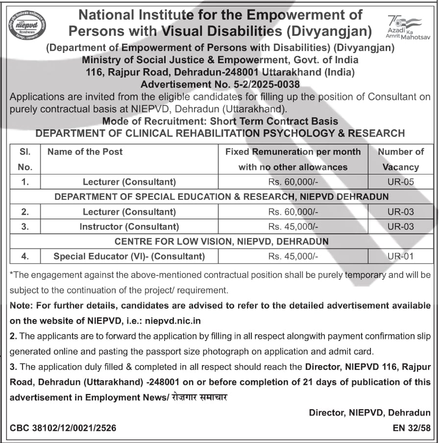 The National Institute for the Empowerment of Persons with Visual Disabilities (Divyangjan) (NIEPVD), Dehradun, under the Ministry of Social Justice and Empowerment, Government of India, has invited applications for the engagement of 12 Consultant posts. These positions include Lecturers, Instructors, and a Special Educator on a short-term contract basis. This recruitment is a valuable opportunity for qualified graduates and postgraduates in relevant fields to contribute to the education and rehabilitation of visually impaired individuals. The last date for submission of the application is 28th November 2025.