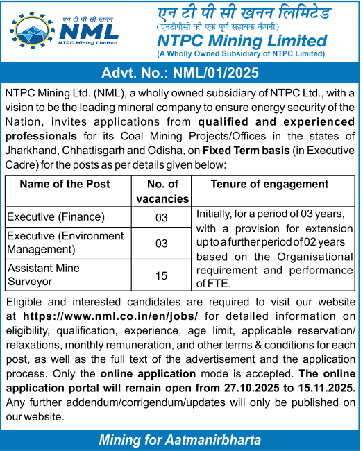 NTPC Mining Limited (NML), a wholly owned subsidiary of NTPC Limited, has announced Recruitment Notification No. NML/01/2025 for the selection of experienced professionals for 21 vacancies. The posts include Assistant Mine Surveyor, Executive (Finance), and Executive (Environment Management). These roles will be appointed on a fixed-term basis at various coal mining projects and offices located in Jharkhand, Chhattisgarh, and Odisha. Eligible and qualified candidates can apply online through the official portal once the link is activated on 27th October 2025. The last date to apply is 15th November 2025. Applicants are advised to read the detailed advertisement carefully before submitting the online application form.