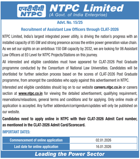 NTPC Limited, India’s largest energy conglomerate and a Maharatna PSU under the Government of India, has released a short notification inviting applications for the post of Assistant Law Officer (E0 Level). The recruitment will be based on the scores obtained in the Common Law Admission Test (CLAT) 2026 for Post Graduate Programme (LLM). This recruitment offers law graduates an opportunity to work across NTPC’s projects and stations nationwide in a structured legal role with growth potential. The application process will begin from 2nd January 2026 and continue till 16th January 2026, exclusively through the official NTPC careers portal.