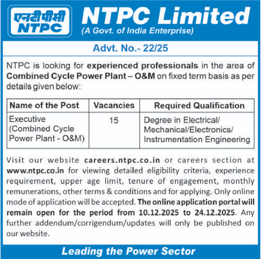 NTPC Limited, a Maharatna Central Public Sector Undertaking under the Ministry of Power, Government of India, has released a notification inviting experienced professionals for recruitment to the post of Executive (Combined Cycle Power Plant – O&M). A total of 15 vacancies will be filled on a fixed term basis across NTPC’s power stations and projects throughout India. Eligible candidates with a B.E./B.Tech. degree in Electrical, Mechanical, Electronics, or Instrumentation Engineering can apply online from 10th December to 24th December 2025. This recruitment is ideal for professionals with relevant operational experience in Combined Cycle Power Plants seeking short-term technical roles in India’s premier power utility company.