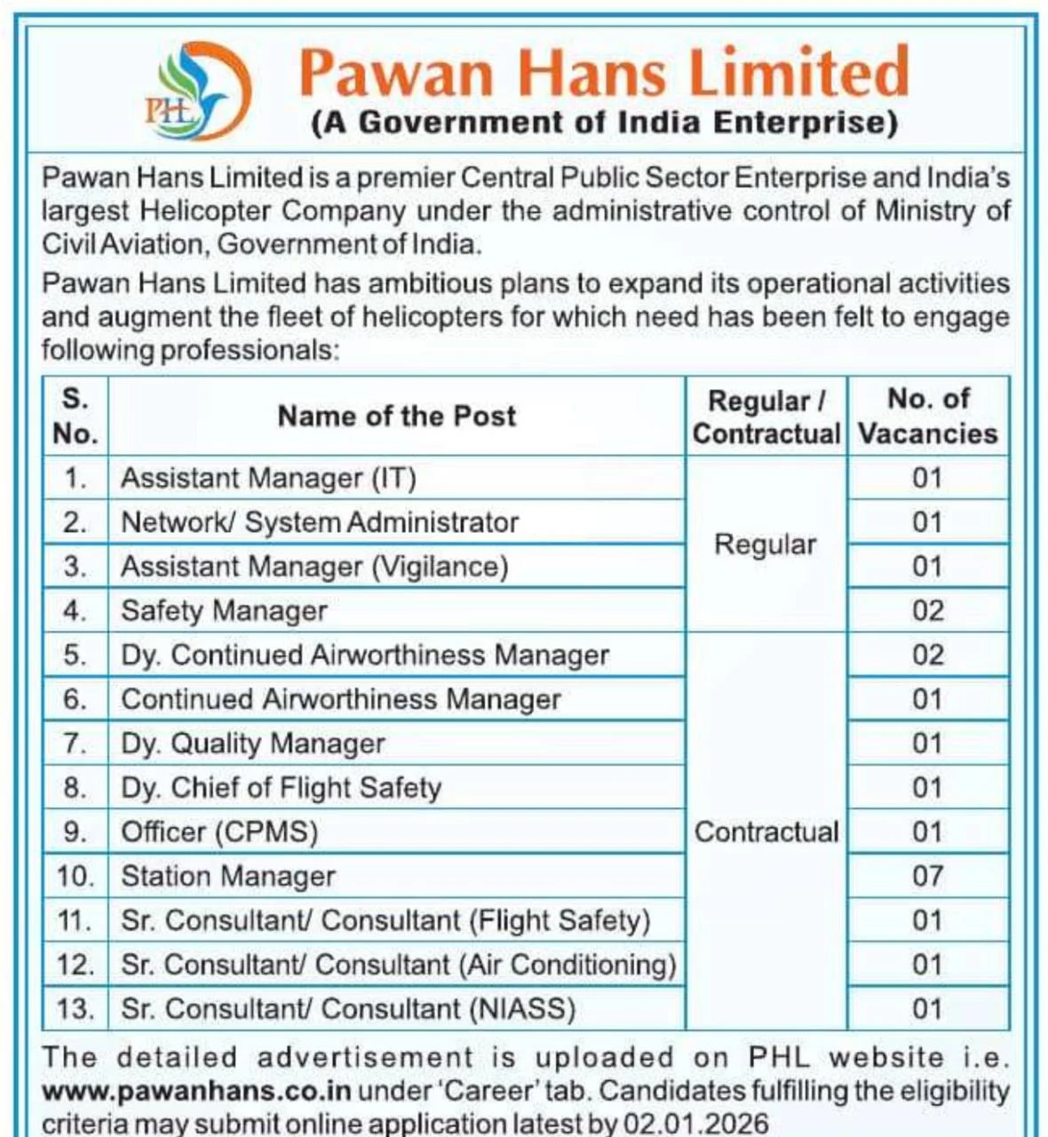 Pawan Hans Limited (PHL), a premier Central Public Sector Enterprise under the Ministry of Civil Aviation, Government of India, has invited online applications for the recruitment of 21 various posts on both Regular and Contractual basis. Known as India’s largest helicopter company, Pawan Hans plays a vital role in connecting remote and inaccessible regions of the country through its helicopter services. The current recruitment includes positions such as Assistant Manager (IT), Safety Manager, Station Manager, Officer (CPMS), Sr. Consultant/Consultant, and others. Candidates with qualifications in Engineering, Management, Journalism, Aviation, or Law along with relevant work experience are eligible to apply.