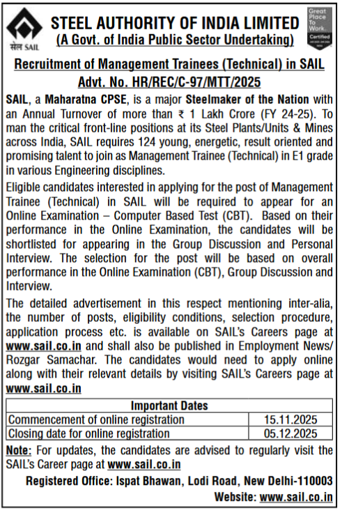 Latest SAIL Recruitment 2026 with list of all current SAIL India vacancy details, online application form and eligibility criteria. The Steel Authority of India (SAIL) is a government-owned business enterprise.