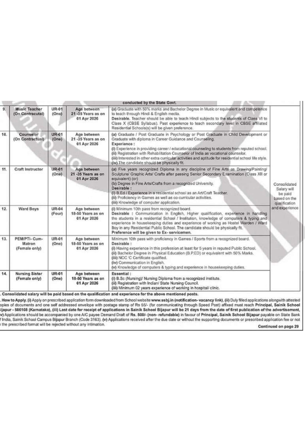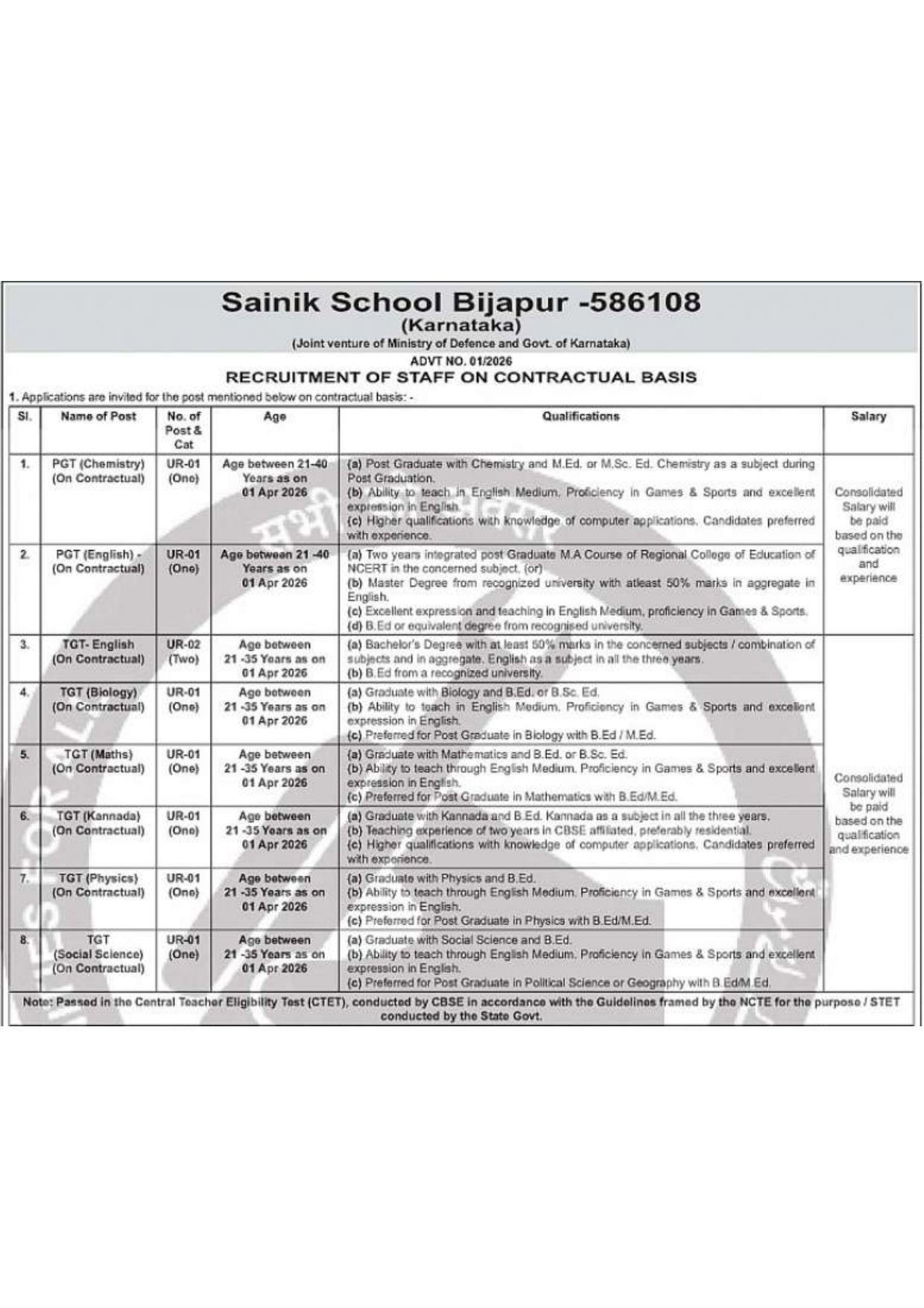 Sainik School Bijapur (SSBJ), a prestigious residential school under the Ministry of Defence, has invited applications for 18 full-time vacancies for both academic and non-teaching posts including PGTs, TGTs, Ward Boys, Counselor, Music Teacher, Nursing Sister, and more. The school seeks experienced and qualified professionals with strong teaching skills, administrative capabilities, and extracurricular proficiencies. The recruitment aims to strengthen the academic, sports, and residential facilities at the campus located in Karnataka. Eligible candidates must apply using the prescribed offline format before 16th January 2026.