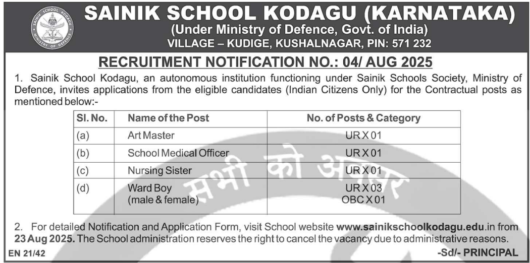 Sainik School Kodagu has released a recruitment notification for multiple contractual posts including Art Master, School Medical Officer, Nursing Sister, and Ward Boy (Male & Female). The recruitment aims to fill a total of 07 vacancies on a temporary basis at the residential school located in Karnataka. These posts are ideal for candidates with qualifications ranging from Matriculation to MBBS, depending on the role. The online application process begins on 23rd August 2025 via the official website www.sainikschoolkodagu.edu.in.