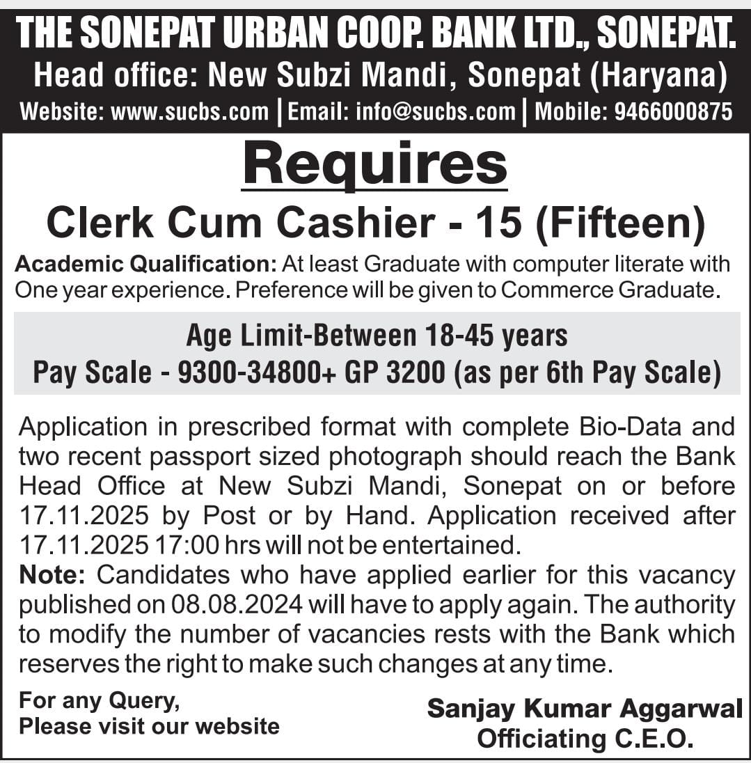 Sonipat Urban Cooperative Bank Limited, located at New Subzi Mandi, Sonipat (Haryana), has invited applications from eligible Indian nationals for the recruitment of Clerk cum Cashier positions. This recruitment drive offers 15 vacancies on a regular basis for graduates who possess basic computer knowledge and a minimum of one year of relevant experience. The bank gives preference to Commerce graduates. The application process began on 10th November 2025 and will end on 17th November 2025 at 5:00 PM. Eligible candidates must apply in offline mode by submitting the prescribed application form to the Bank’s head office either by post or by hand.