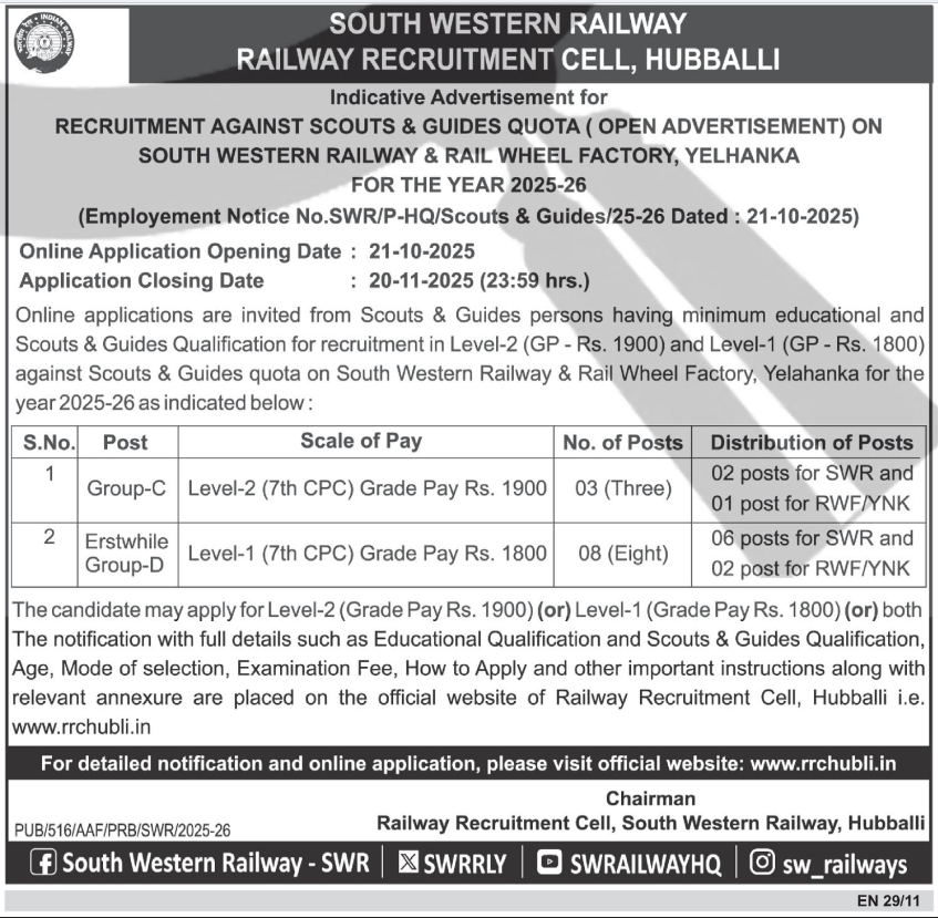 The South Western Railway (SWR), through its Railway Recruitment Cell (RRC) Hubballi, has released an official notification for the recruitment of 11 posts under the Scouts and Guides Quota for the year 2025–26. The vacancies are distributed across Level-2 and Level-1 posts in South Western Railway divisions and the Rail Wheel Factory (RWF), Yelahanka. Candidates with required academic qualifications and active scouting achievements are eligible to apply online. The last date to apply is 20th November 2025.