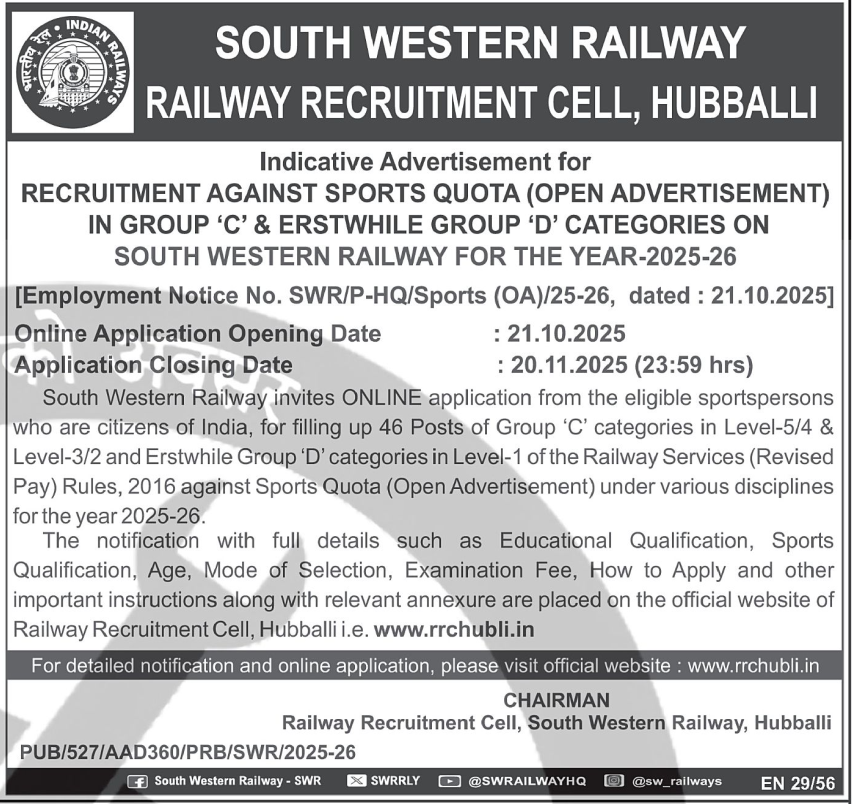 South Western Railway Sports Quota Recruitment 2025: Apply Online for 46 Group C & Group D Posts | Last Date: 20th November 2025